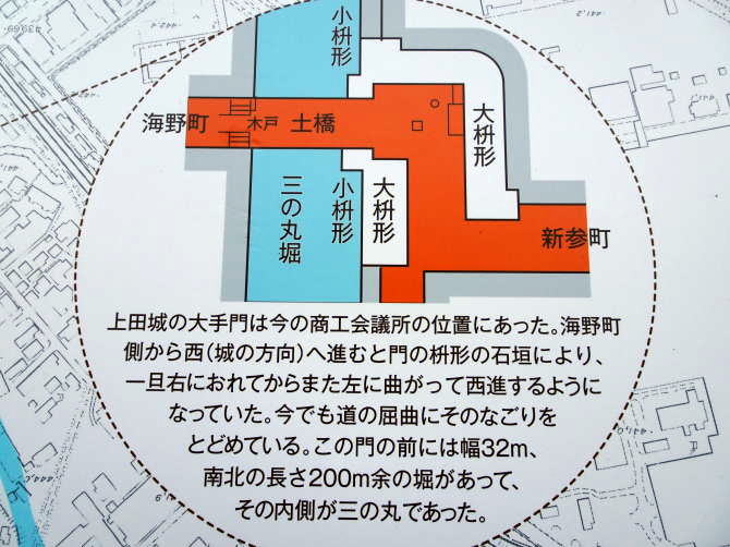 これを見ると現在の上田商工会議所付近に大手門があり、埋め立てれられていますが堀が横に通っていたことが分かります。