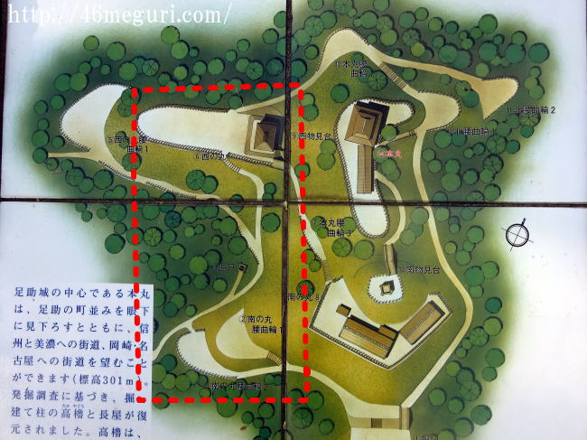 まず最初に周るのはこの範囲です。南の丸腰曲輪〜西の丸。入口をくぐり足助城の西側ですね。