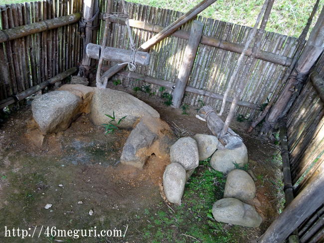 まずはカマド跡。ここには焼けた石が並んでいて、周辺に木じり(燃えかけの木)や炭、灰が散乱していたそうです。そのことから、炊事などに使われたカマドがあったと思われ再現されました。