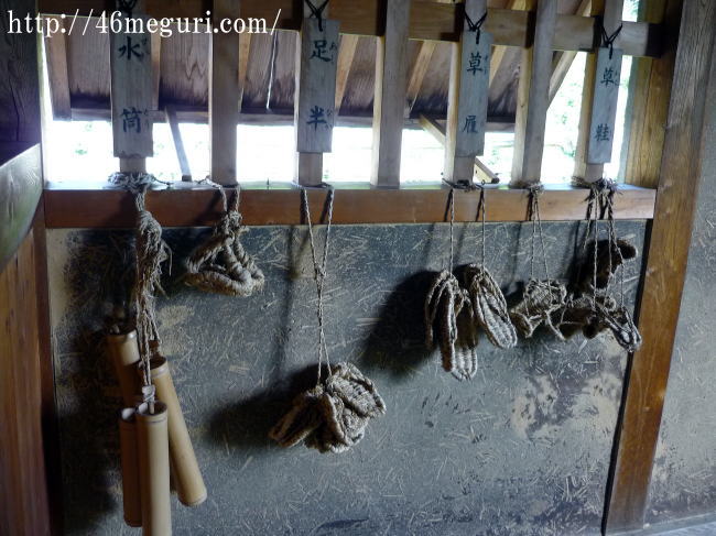 壁にかかっていた、水筒をはじめ足半(あしなか)、草履(草履)、草鞋(わらじ)。