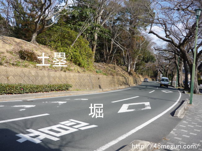今でも土塁が残っていますが、前の道路はかつての堀跡です。