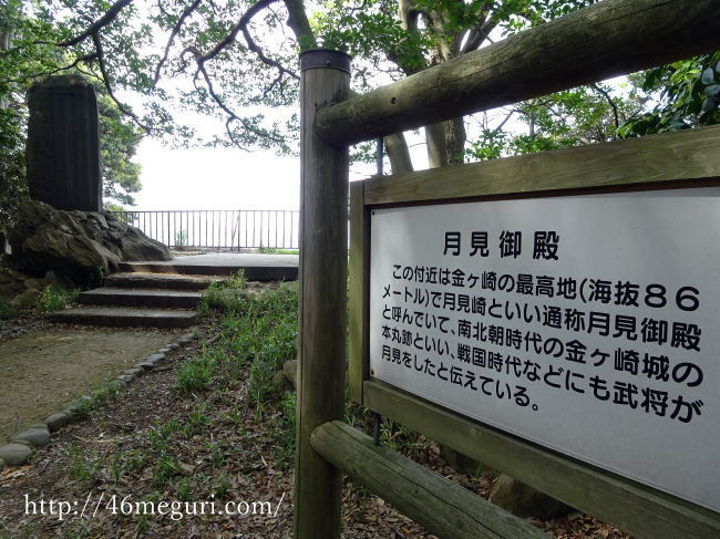 金ヶ崎城を奥へと進んでいくと、月見御殿跡といわれる場所があります。看板にも書かれていますが、ここは南北朝時代の金ヶ崎城の本丸と考えられる場所で、海抜86メートルの最高地にあるんです。
