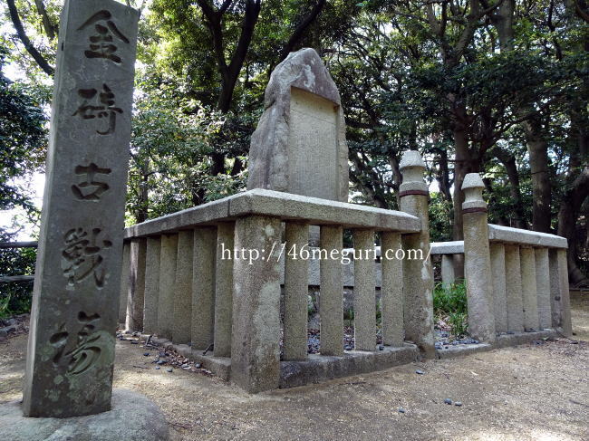 城内にある金ヶ崎古戦場の石碑。金ヶ崎城は南北朝時代から数回、戦いがあった城なので古戦場ともいえますね。