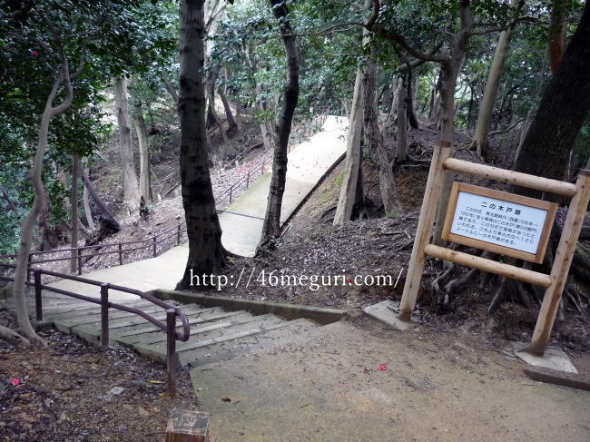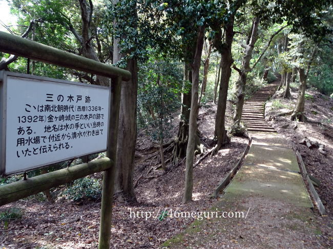 城内の歩道はコンクリートで舗装されているので歩きやすいですが周辺は森の中ですね。ちなみに画像は二の木戸跡で、南北朝時代(1336〜92)の金ヶ崎城の戦いで、この付近で激戦が起こりました。
