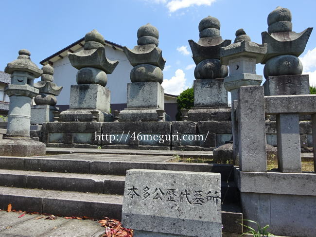 丸岡城歴代城主ゆかりの菩提寺(ぼだいじ)・本光院。境内には丸岡藩祖の本多重次をはじめ、初代藩主成重、2代重能、3代重昭の墓碑があります。