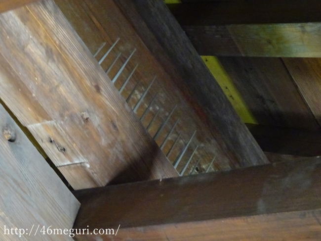 三階の天井の梁を見てみると…何?トゲトゲがある!もしかして忍び(忍者)返し?!と、思ってガイドさんに聞いてみたら、鳥除けだって(笑)。