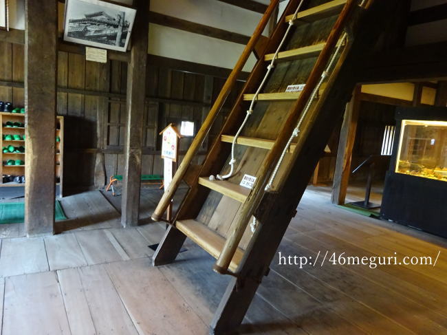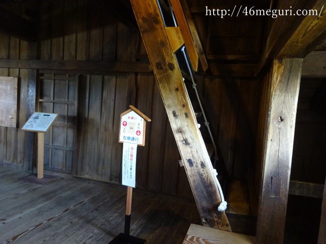 そして階段で2階に登ろうとしますが…この角度です!愛知県犬山市の犬山城もこれくらい急な階段が残っています。これは天守内に入った敵兵をスンナリ登らせない工夫といわれています。