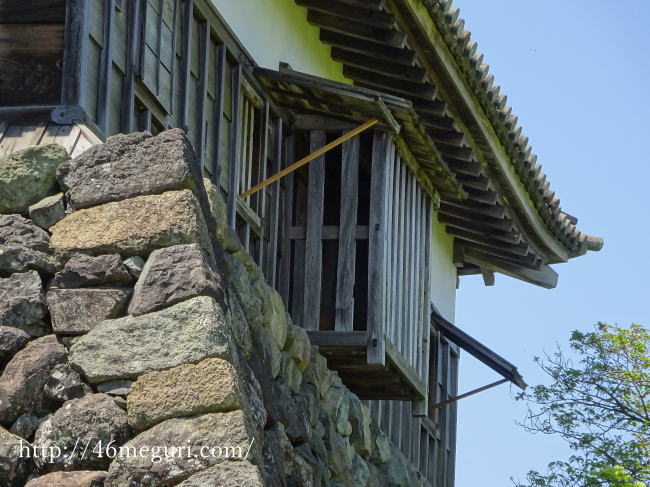 石落としを横から見るとこんな感じです。スキマだらけに見えますが、逆に言えば壁になっているよりスキマになっている方が、城内から火縄銃や矢で攻撃しやすいということです。