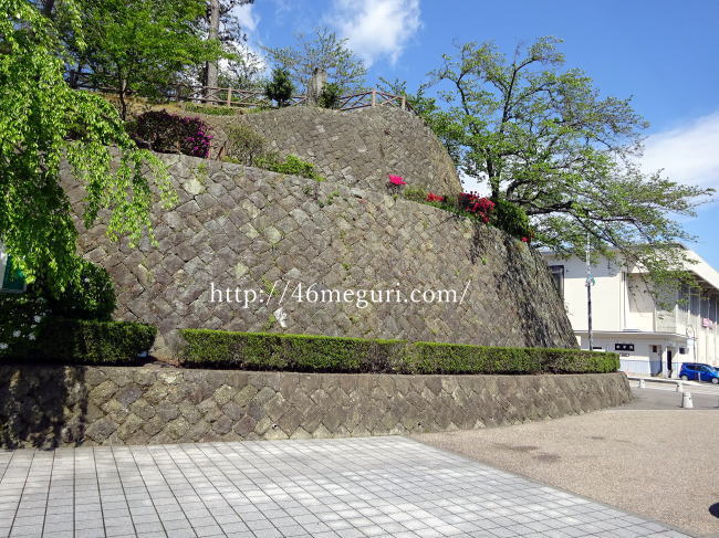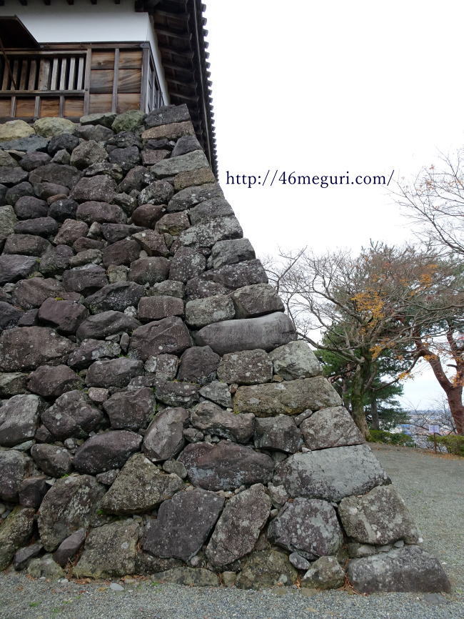 これは天守台の石垣。工法は自然石をほとんど加工せずに積み上げる野面積み(のづらづみ)という工法です。