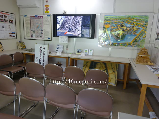 丸岡城の日本100名城スタンプが置いてある場所で、丸岡城料金所の隣にある観光案内の部屋です。ここにスタンプが置いてあります。また観光パンフや丸岡城の見どころをビデオで説明しており、丸岡城天守に入る前にチェックしておくと良いですよ。