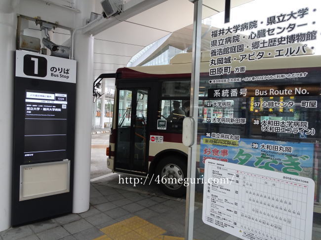 電車とバスで丸岡城への行き方の一例を説明します。まず電車で行く場合はJR福井駅を目指します。福井駅前にバス乗り場があるので、1番乗り場から出ている京福バスに乗り、丸岡城バス停で降りればOKです。ちなみに所要時間は約1時間。料金は670円です。(2024年3月現在)