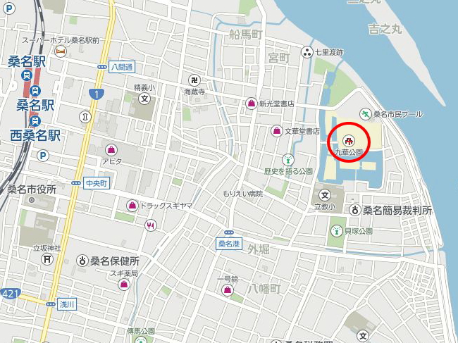次に車での行き方について説明します。車で桑名城跡にアクセスする場合は、カーナビの検索で桑名城、もしくは九華公園(きゅうかこうえん)と検索すると出てくると思います。またロードマップでアクセスする場合は、桑名城跡の住所をチェックしてみましょう。
