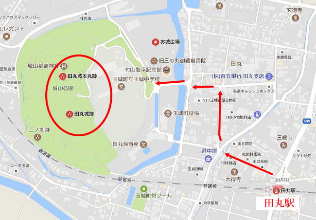 もし無ければ玉城町役場(たまきちょうやくば)と検索してみてください。役場の裏山が田丸城跡です。