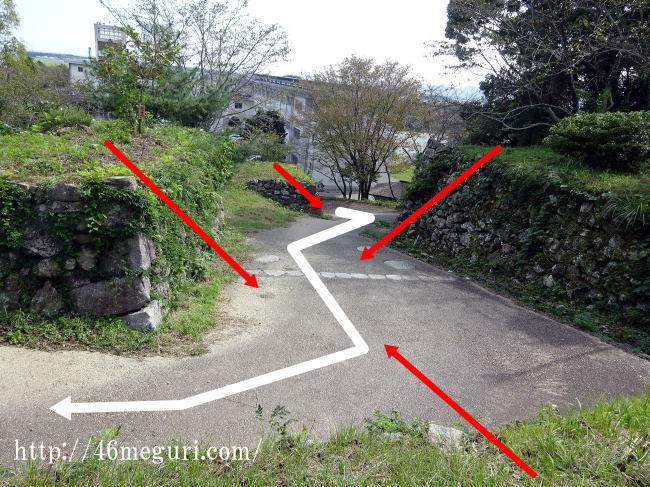 こちらは二の丸にある富士見櫓付近の虎口。こちらも下から城内に侵入してくる敵に対して、側面攻撃ができる様に工夫されているのが分かりますね。