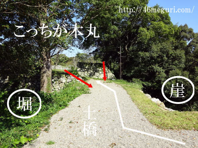 土橋の特徴は攻める敵が横展開できない様に、左右に堀などを設け、敵を縦並びにする防御の工夫です。