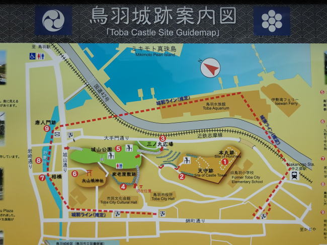 こちらは現代の鳥羽城跡案内図。城域の区画線を見ると、現在の鳥羽水族館や国道42号線、そして鳥羽市役所も鳥羽城の中だった事が分かります。