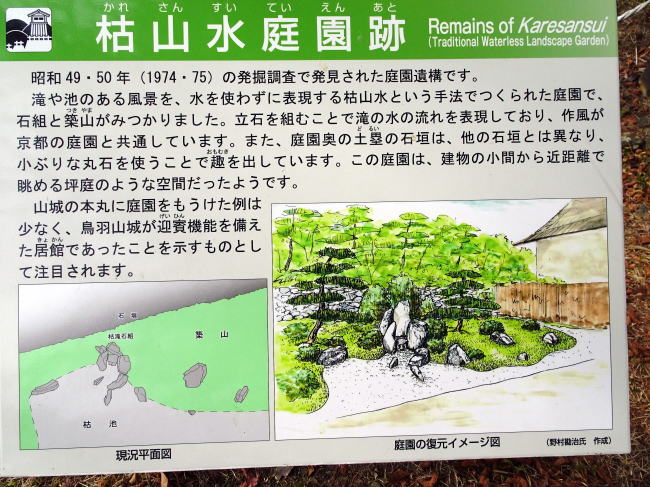 この事から鳥羽山城は城主が普段生活していた建物があり、迎賓のための庭園があったという事。そして鳥羽山城は天守があった事から、戦になった時に籠城するための詰めの城という事が考えられます。
