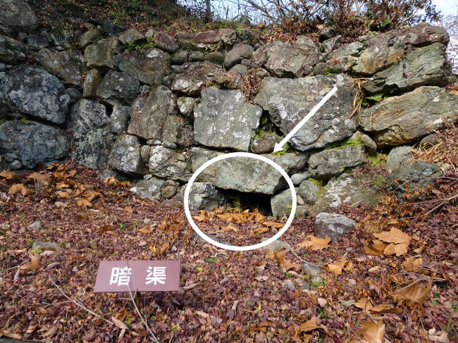 本丸虎口の石垣を見ると、何やら穴が開いています。これは暗渠(あんきょ)跡で、分かりやすく言うと排水の穴です。本丸から外側に向けて排水できる様になっています。