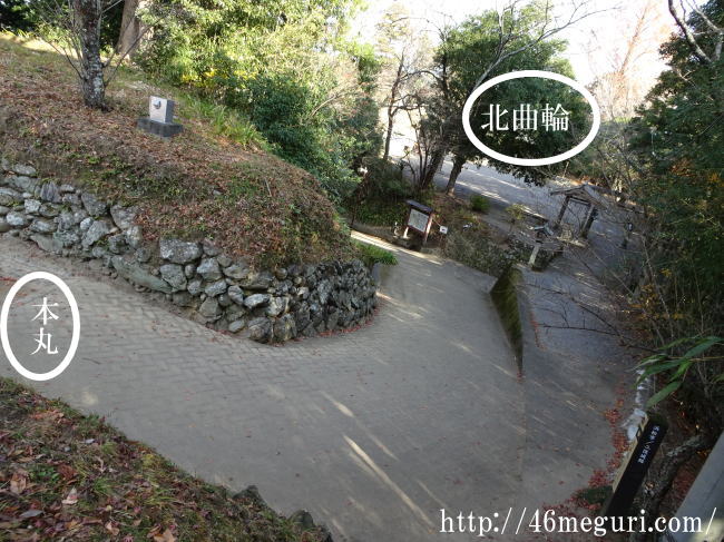 北曲輪の後ろから攻めてくる敵がいるとするなら、本丸に至るまでに道を曲げてあるので、本丸や北曲輪から側面攻撃を受ける事になります。