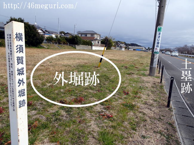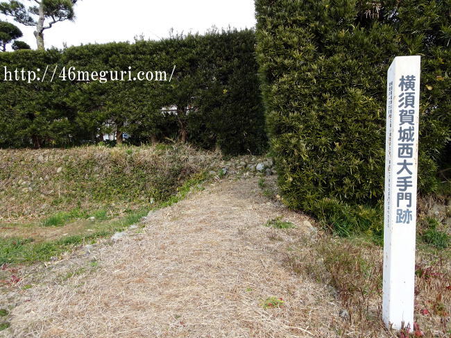こちらは横須賀城西大手門跡。横須賀城には西と東の2つの大手門があった事がわかっています。東側は碑が建つのみで遺構がよく分かりませんが、西大手門跡は外堀跡に面しており、遺構がよく分かります。