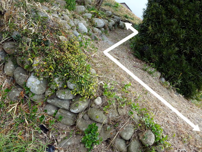 でもかなり細く、横矢掛けの屈折なのか?それとも後世たまたまこうした作りになったのかよくわかりません。ちなみに奥に行くと民家に繋がっています。