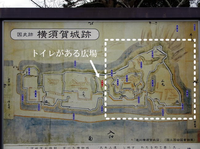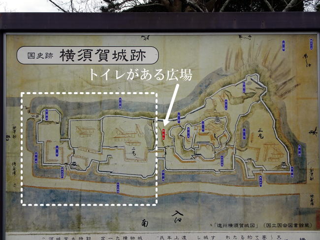 横須賀城に到着したら、まずはトイレがある広場に行くことをオススメします。なぜかというと、その広場に横須賀城の大きな縄張り図があるからです。まずはここで作戦会議。