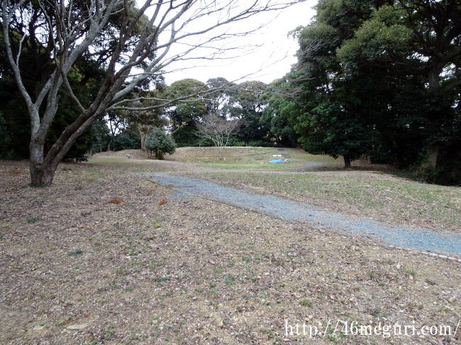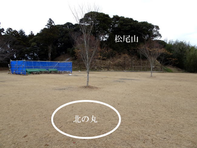 三日月堀を過ぎて、本丸下をぐるっと周ってみましょう。すると北の丸という広い削平地に出ます。その先にこんもりした小山があるのですが、これが横須賀城の松尾山です。