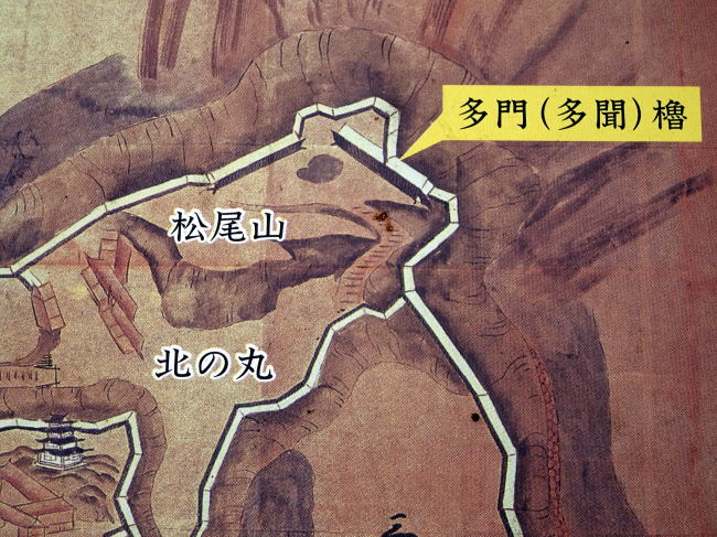 これは江戸時代の古地図。まず左下に天守がある本丸がありますね。そしてそのナナメ右上に北の丸。そしてその先に松尾山があるのですが、古地図によると松尾山には多門櫓もあったみたいです。