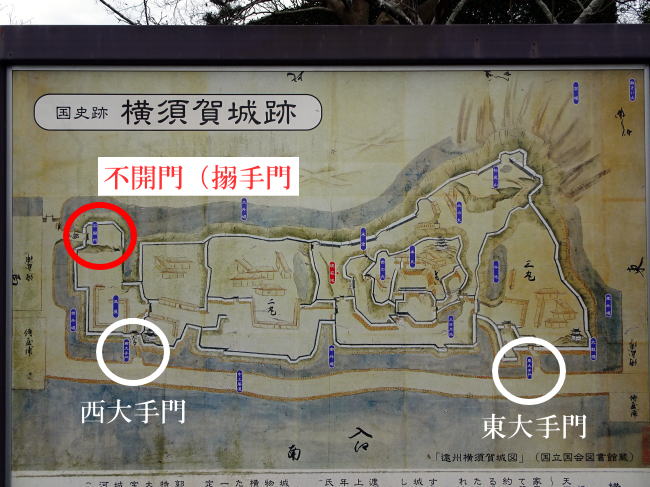 次にチェックしておきたいのが不開門(あかずのもん)跡。横須賀城の搦手門(裏口)跡です。
