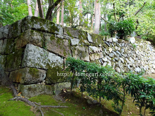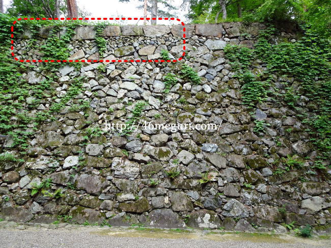 そして奥へ進むと石垣群があります。丹波亀山城跡の石垣は時代の節々で整備されており、石垣も積みなおされた箇所がいくつもあります。